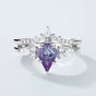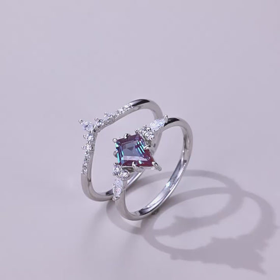 This architectural stack ring features a striking rhombus-cut alexandrite that shifts from cool teal to warm purple. Its layered design and modern silhouette create a quiet statement of depth and individuality.